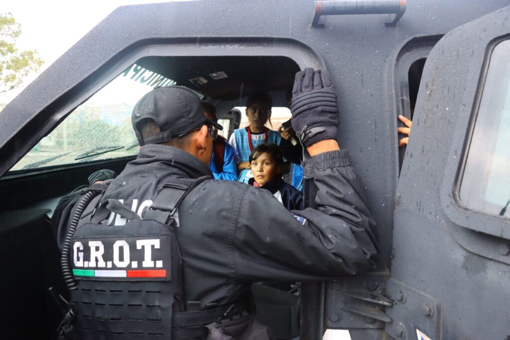 Aún con la lluvia se pudieron realizar las actividades programadas, como el paseo con elementos motorizados, la exhibición del vehículo blindado y una breve charla por parte del Grupo de Reacción y Operaciones Tácticas (GROT), sobre sus funciones policiales.